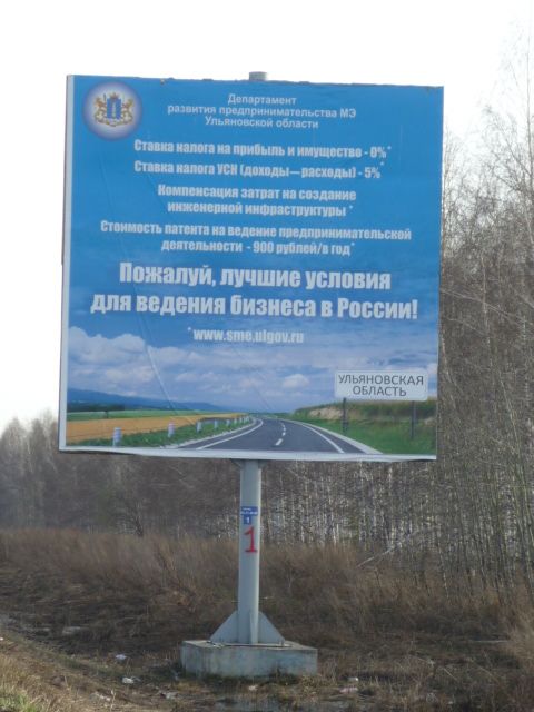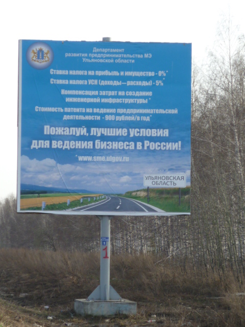 В плане привлекательности бизнеса показательна дорога между Алатырем и Сурское при въезде в Ульяновскую область, где на протяжении довольно продолжительного периода времени стоит билборд: “Пожалуй, лучшие условия для ведения бизнеса в России” (имеется ввиду в Ульяновской области). После въезда в Ульяновскую область, после оптимистичного стенда раскинулось село Ждамирово. Вот оцените состояние дороги там: 3 марта 2012 года ,19 апреля 2012 года и 30 мая 2012 года. Может, перед присвоением нового звания городу Ульяновску что-то изменилось. Или, можно предположить, звание самого привлекательного города для ведения бизнеса в России относится только к областному центру, а область здесь ни при чем.